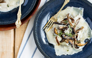 This flavourful ravioli comes together quickly thanks to packaged wonton wrappers. A creamy béchamel style sauce complements the roasted mushrooms