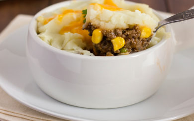 This updated version of shepherd’s pie is a a blend of ground beef, chopped mushrooms and mixed vegetables and topped